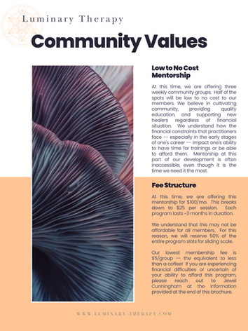 At this time, we are excited to offer three low cost mentorship groups. We believe in cultivating community, educating, and supporting new clinicians regardless of financial situation. We understand how poorly paid mental health clinicians are -- especially in the early stages of one's career. It is important to find support networks, especially when early in one's career when finances may preclude one from this privilege. Feel free to reach out if you have questions about our model or would like to join!